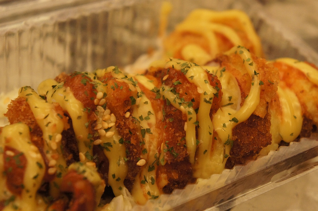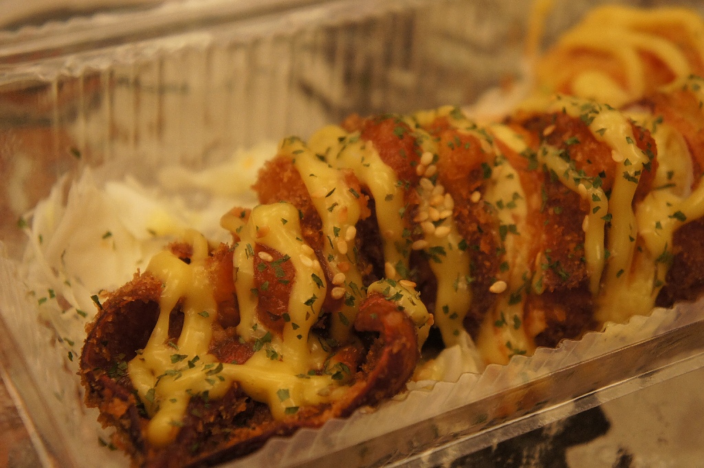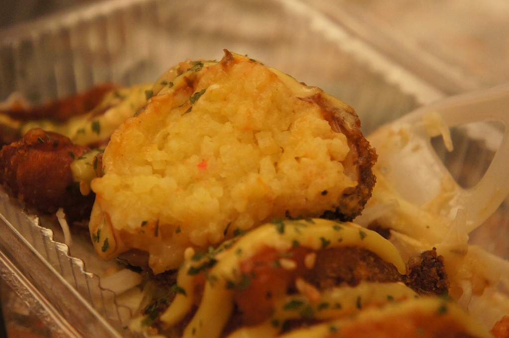 所謂的烏賊燒其實就是烏賊肚子裡塞了海鮮燉飯的一種產品,烏賊燒有蜂蜜芥末、泰式甜辣、芥末沙拉、百香果沙拉和五香海鮮這幾種口味,這次買的是蜂蜜芥末口味。透明盒子裡除了一隻烏賊外還有一些生菜絲,烏賊身上交織著蜂蜜芥末醬,打開來混合著醬跟烏賊的香氣,還挺誘人的。