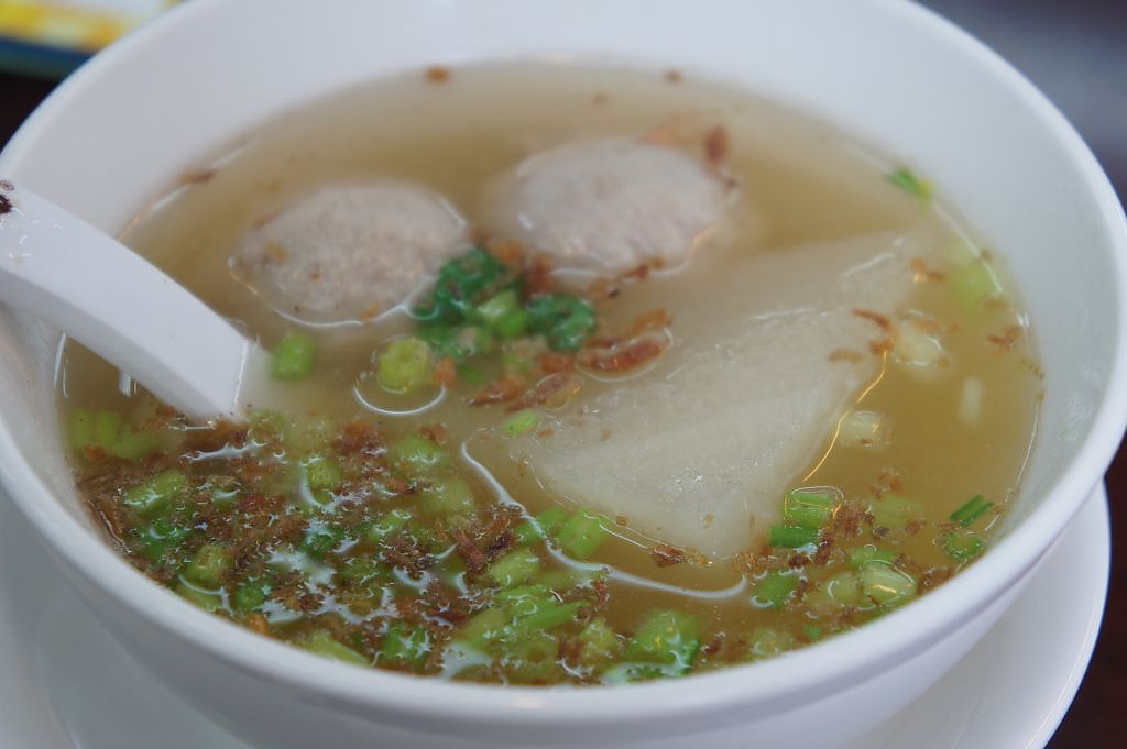 貢丸湯裡頭還有兩塊滿大的白蘿蔔,燉得也相當軟,入口可嚐到白蘿蔔的鮮甜,貢丸還算有咬勁,但偏硬且不是很多汁,表現普通,湯頭雖加了芹菜末提香,但整體湯頭不是我的菜,喝不出官網上所說的大骨熬製四個小時的湯底的美味,我反而更喜歡新竹一些特色小店的貢丸湯,清甜鮮美。