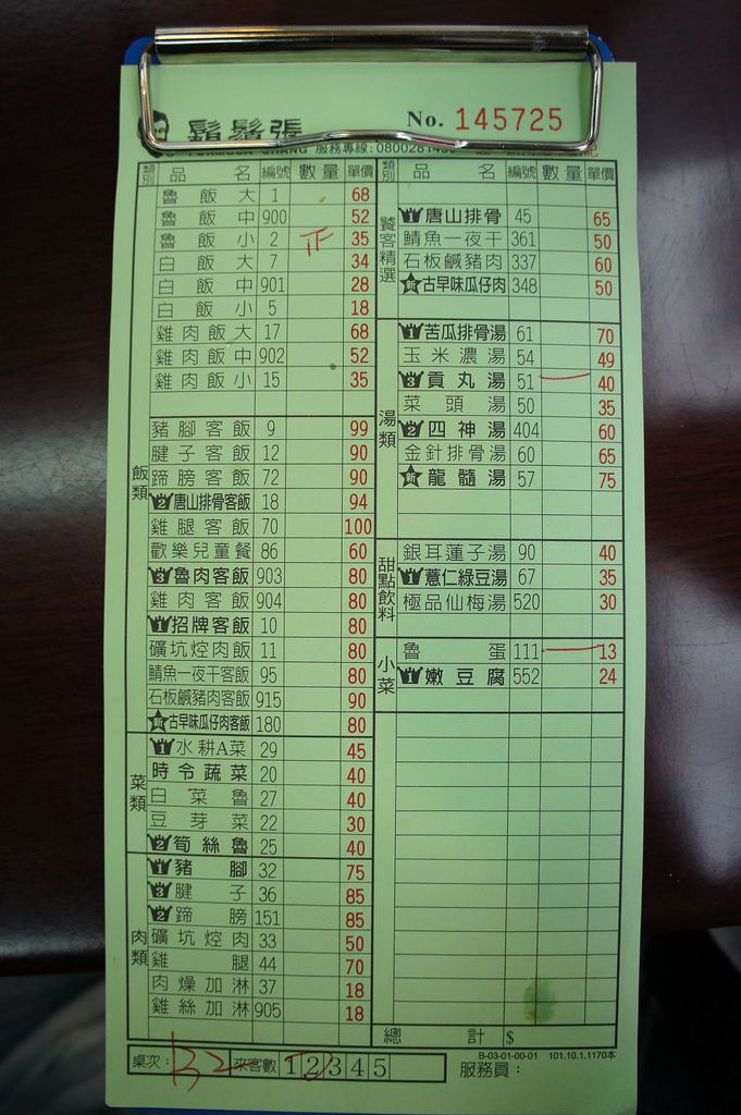 坐下不到一分鐘,就有服務人員拿著菜單過來問說要不要點菜,而在這位服務人員點菜的同時還有另一位服務人員從旁放了兩雙筷子在我們桌上,只能說一切都在好快速的情況下進行,好險在前往鬍鬚張的途中我們已經稍微盤算了一下大概要點些什麼,否則還真是會被這俐落急促的服務速度給嚇到。