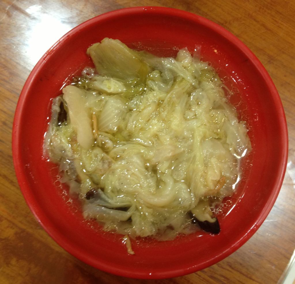 白菜滷小小一碗,看起來跟戽斗魯肉飯的白菜滷有點像,烹調的方式也有點類似,都是屬於比較清淡的口感,但第一碗的白菜滷略鹹了點,有點把白菜的鮮甜味蓋住了,有點可惜,我們還是比較偏好戽斗的白菜滷一些。