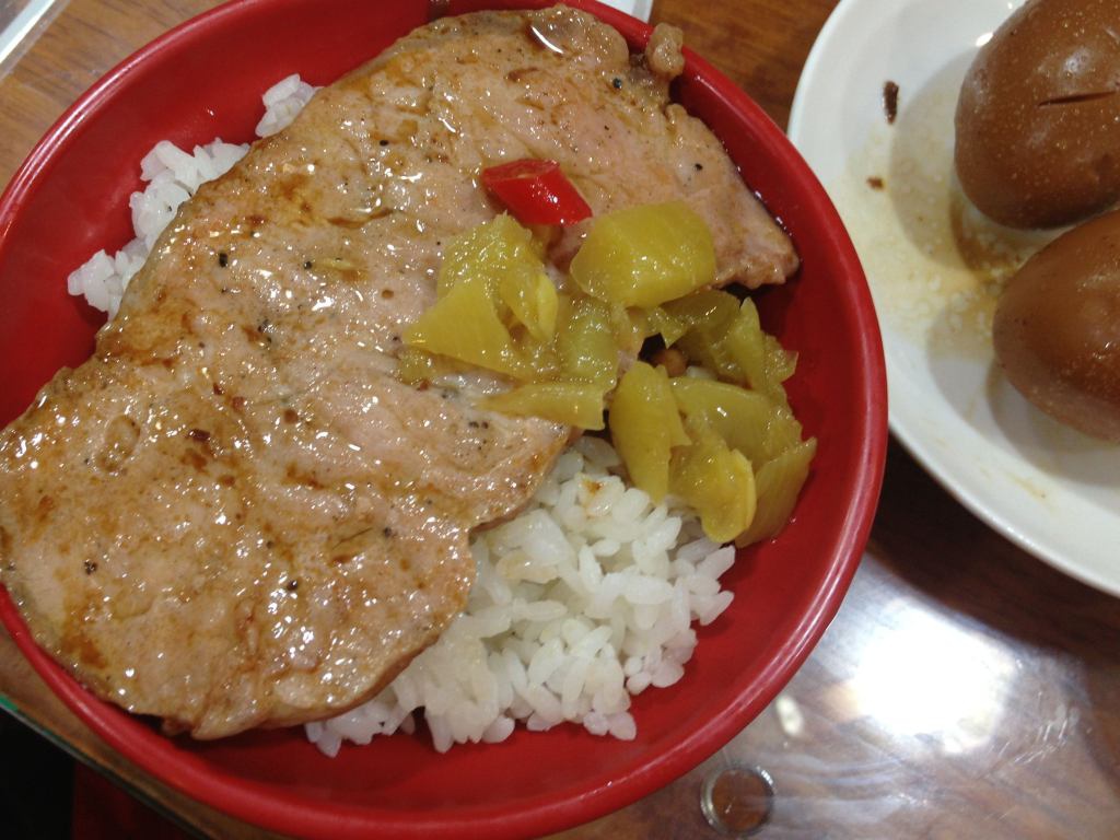 因為人潮實在相當洶湧,所以出菜的速度有點緩慢,大概等了十分鐘左右才開始陸續上菜。30元的豬排魯肉飯顧名思義就是多了塊豬排蓋在滷肉飯上,豬排出乎意料地非常軟嫩,一點筋性都沒有,帶著淡淡的滷汁香很下飯,滷肉飯肥瘦肉都有,還多了一撮酸菜提味解膩,飯挺乾爽的,肉燥口味稍重了些,但以15元的價位而言真是相當划算。