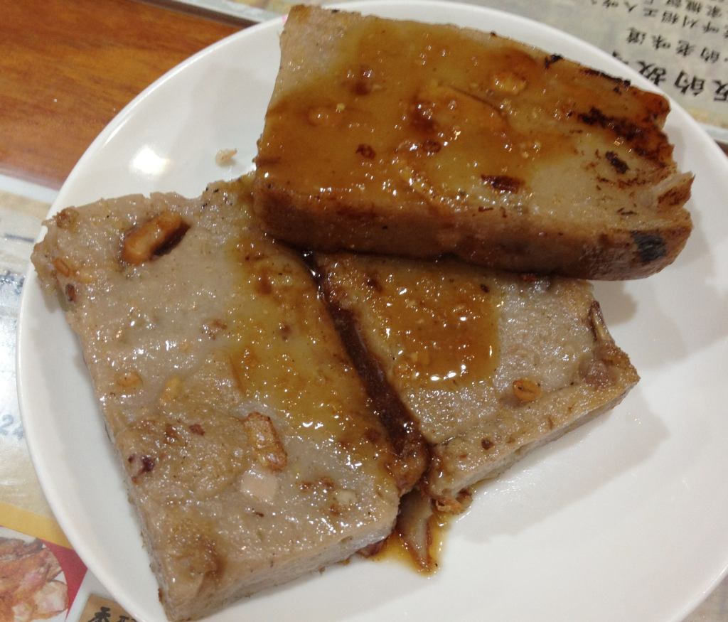 最讓我們驚豔的是這份芋頭糕,我個人不太喜歡芋頭的味道,但這芋頭糕是繼竹東邱排骨酥麵後第二種讓我敢入口的芋頭料理,外表煎得酥酥的,但裡頭的芋頭糕卻非常綿密可口,摻入的小蝦米、魷魚塊等讓整個風味跟口感更豐富,本身味道就已經很足夠了,所以即使不沾上頭的醬汁也非常好吃!