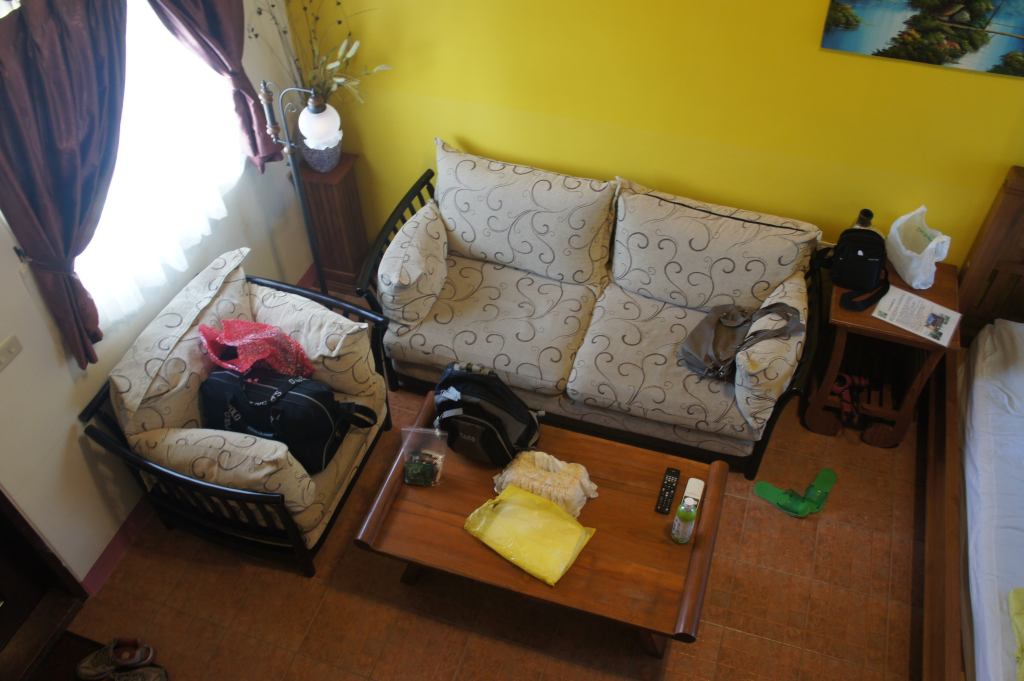 雖然隔成樓中樓,但可能是室內家具較多,覺得空間比較小一些,而且剛進房時覺得屋內有點悶,我們還打開空調來讓空氣稍微流通一下。不同於金澤居的快煮壺,房內用的是一整台的飲水機,讓飲水不虞匱乏,相當不錯。房裡附的咖啡包有點太甜了,還是金澤居附的伯朗咖啡包稍微好一些。