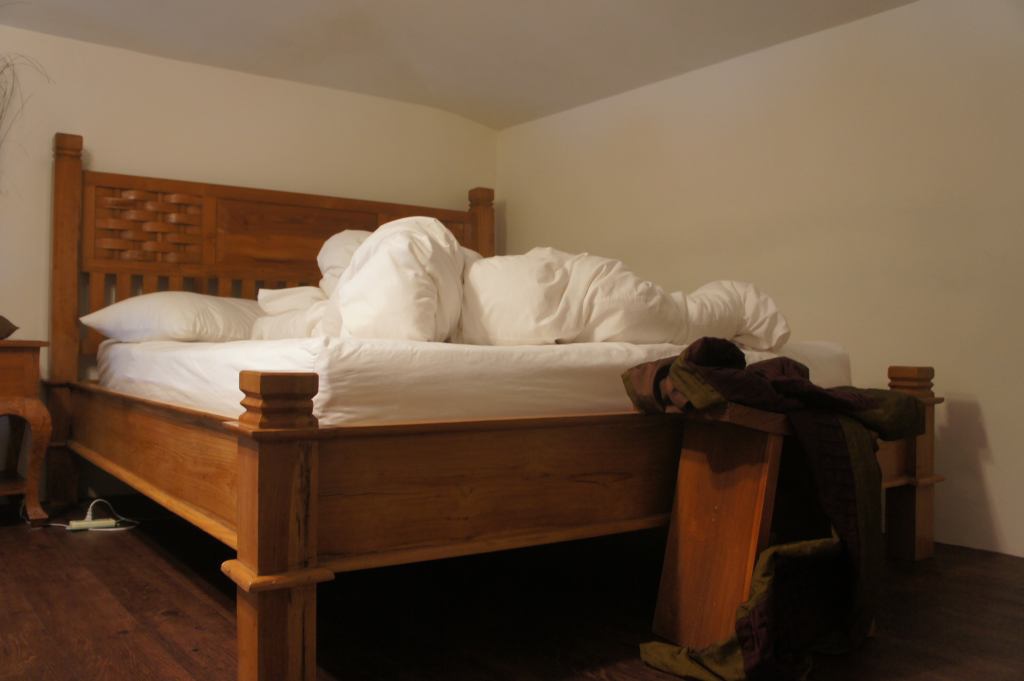 這是樓中樓的床鋪,木頭的床框很有質感,床旁邊還有一盞漂亮的小燈。