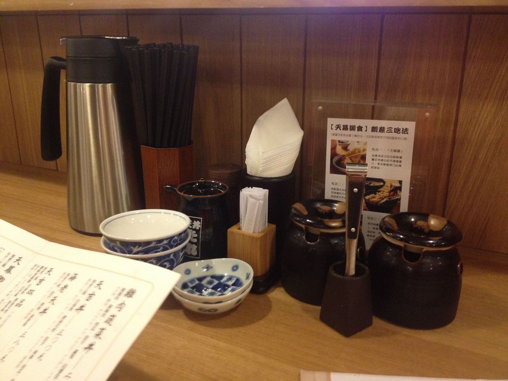 這一層一向是美食的集散地,除了銀湯匙、勝博殿外,最近更開了Mr. Onion跟天吉屋,一上樓接近天吉屋的周圍就聞到了濃濃的炸物香氣,服務人員說因為用芝麻油去炸,所以香氣更特殊。這天來是週五中午,但不管是Mr. Onion或是天吉屋都幾乎是滿座的,我們也因願意坐吧台區而免於等待。