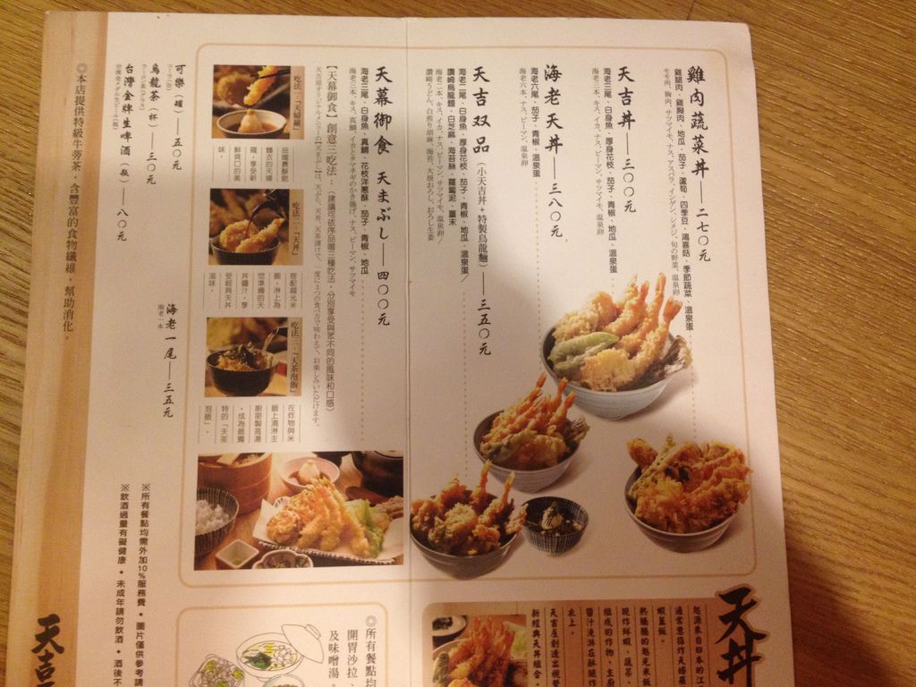菜單只有一整頁,五種丼飯陳列其上:雞肉蔬菜丼、天吉丼、海老天丼、天吉雙品、天幕御食。其中天吉雙品是天吉丼的豪華版,多了一份烏龍麵;天幕御食則提供了創意三吃法。所有餐點皆附開胃沙拉跟味噌湯。