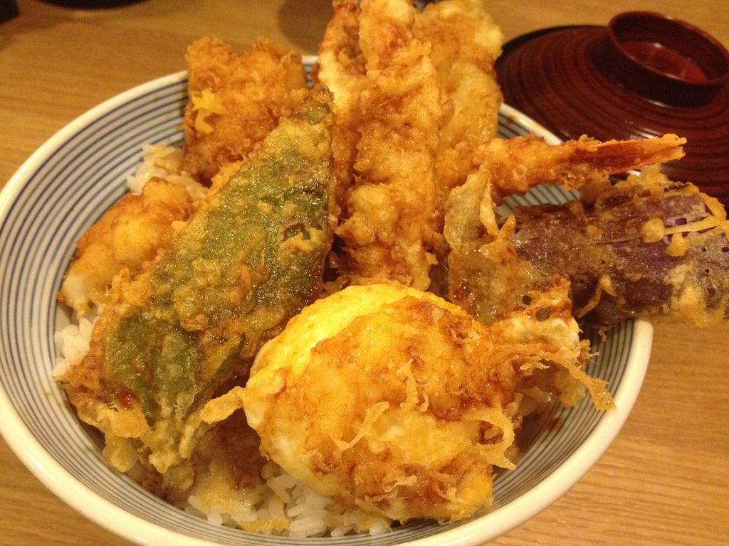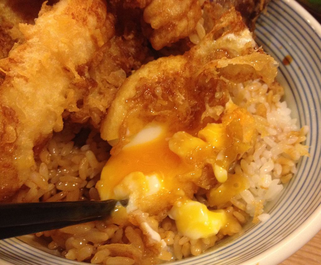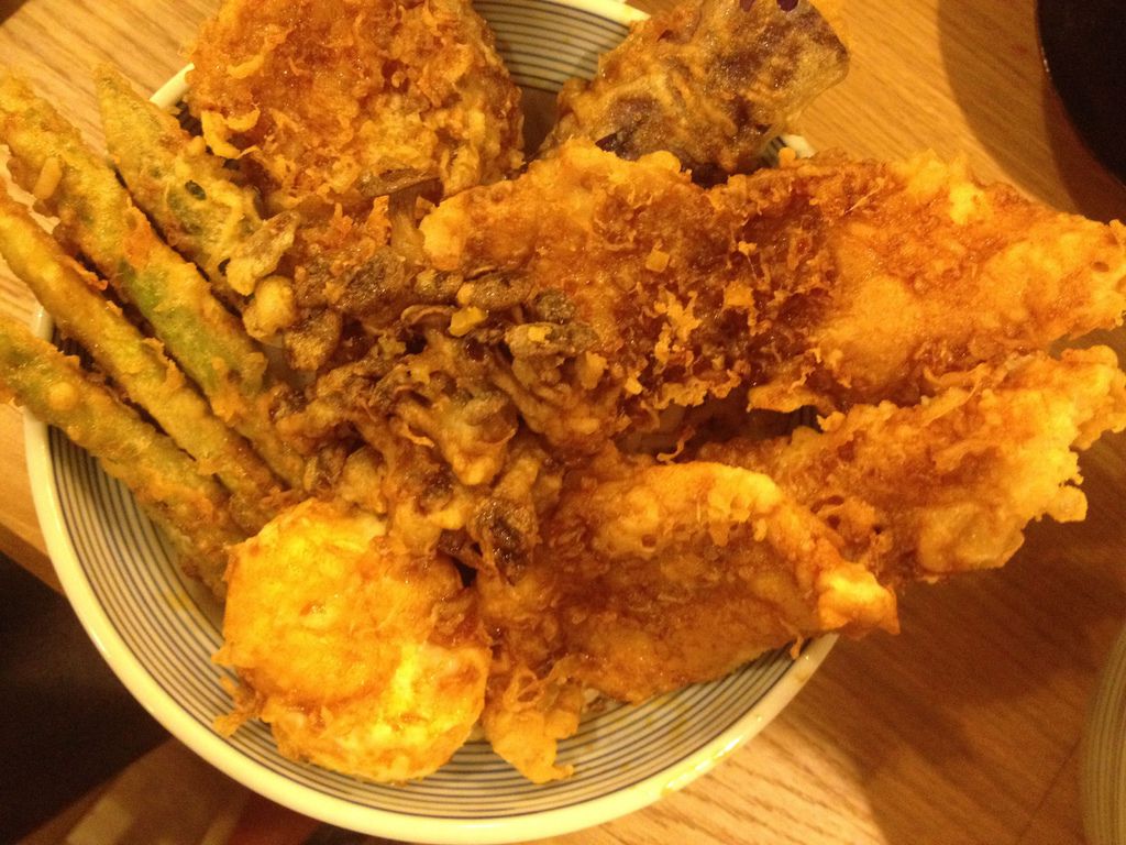 等了好一陣子才上桌的天吉丼寬大的碗中堆疊了好多樣金黃色的炸物,香噴噴的讓人食指大動。天吉丼以海鮮與蔬菜為主,搭配上炸溫泉蛋真的非常豐富。